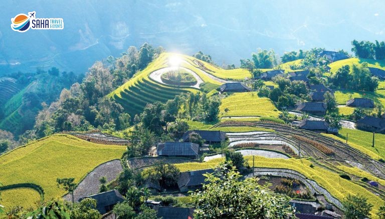 Bản Phùng được ví như trái tim của Hoàng Su Phì với kỳ quan ruộng bậc thang nức tiếng. Từ trên cao nhìn xuống, thửa ruộng bậc thang vàng óng ả ôm ấp lấy từng mái nhà, ẩn hiện dưới làn mây nhàn nhạt buổi sớm khiến khung cảnh quá đỗi nên thơ.